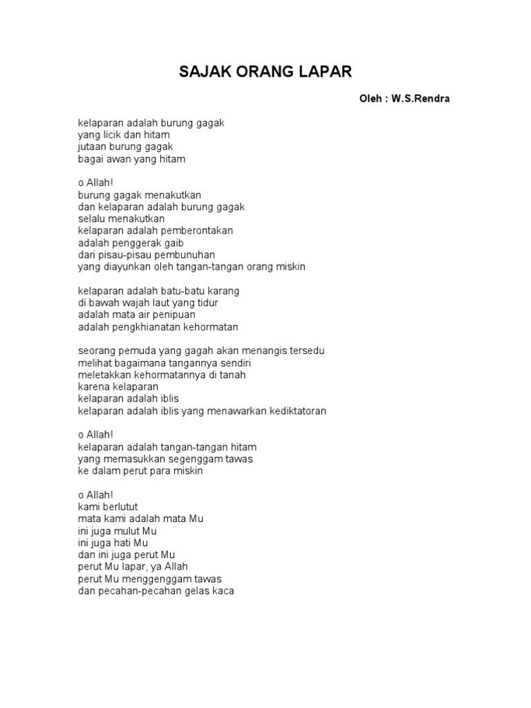 1 from Puisi balada ws rendra yang dikenang sepanjang masa dkampus. Orang orang miskin berbaris sepanjang sejarah bagai udara panas yang selalu ada bagai gerimis yang selalu membayang. Ada satu puisi yang setiap kali aku membacanya, selalu saja aku tak mampu menahan air mata. Puisi ws rendra orang orang miskin kt puisi. Rumput dan lumut jalan raya. Puisi w s rendra orang orang miskin pengertian puisi adalah suatu karya sastra tertulis dimana isinya merupakan ungkapan perasaan seorang penyair dengan menggunakan bahasa yang bermakna semantis serta mengandung irama, rima, dan ritma dalam penyusunan larik dan baitnya. Kumpulan puisi karya chairil anwar ws rendra yang menohok prrrm. Mohon bantu klik di sini untuk like dan subscribe ya.